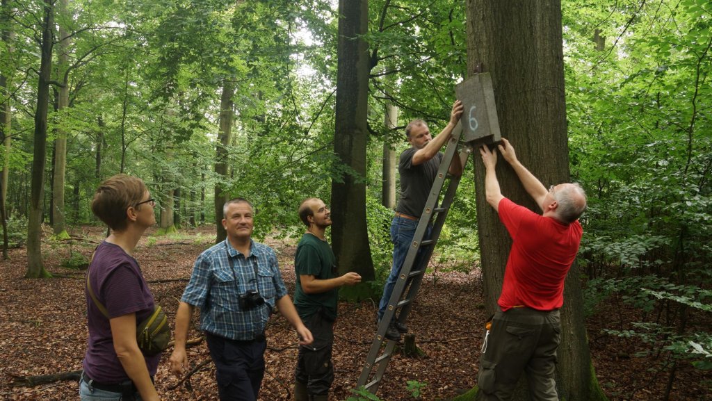 Colette, Jens, Maxim, Ulrich, Joachim und Heiko bildeten ein Team um die über 100 Fledermauskästen im Roitzscher Wald auf Besatz zu kontrollieren. | Foto: Heiko Goldberg