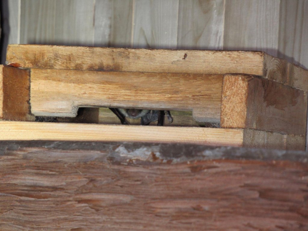 Zusätzliches Spalten- oder Hangplatzangebot in Dachböden werden von Fledermäusen gerne genutzt. Hier erkennt man Nase und Flügel eines Mausohrs, das sich den Kirchdachboden mit Braunen Langohren teilt. | Foto: Bianka Schubert
