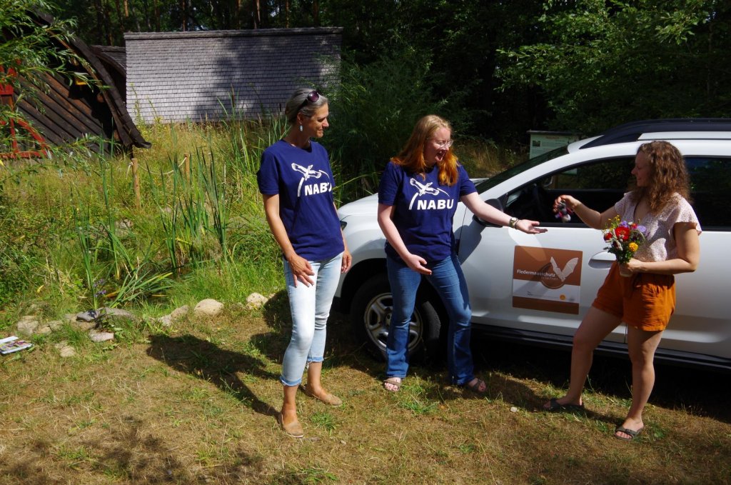 „Um meine Arbeit durchführen zu können, muss ich mobil sein“, erzählt die NABU-Referentin für Fledermausschutz Bianka Schubert, die auch das seit 2018 bestehende Projekt „Quartierpaten für Fledermäuse gesucht“ beim NABU Sachsen leitet. In Sachsen betreuen aktuell mehr als 100 ehrenamtliche Patinnen und Paten über 150 Fledermausquartiere. Sie benötigen Anleitung bei der Zählung der Quartiere, Einweisung in ihre Aufgaben und Fachberatung. „Wir unterstützen die Quartierpaten vor Ort. Deshalb sind lange Fahrten innerhalb Sachsens nicht selten, auch nachts“, fügt Bianka Schubert hinzu. Außerdem werden im Rahmen des Projektes Exkursionen und Schulungen für Fledermausinteressierte sowie Netzfänge oder Infostände bei Veranstaltungen angeboten. Die Abholung geschwächter oder verletzter Fledermäuse gehört ebenfalls zu den regelmäßigen Aufgaben der Fledermausschützerin. „Ein Auto ist daher unbedingt nötig“, meint Bianka Schubert und freut sich, als die MEP-Mitarbeiterin Claudia Süß ihr den Schlüssel überreicht. Mit den zusätzlichen Spenden, die durch den Aufruf des NABU Sachsen zusammengekommen sind, werden die Betriebskosten des Batmobils gedeckt.