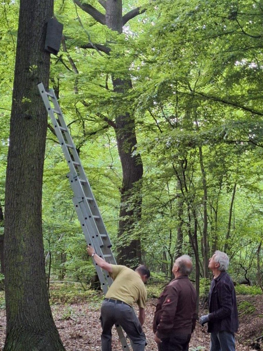 Neue Kästen für Fledermäuse werden im NSG „Waschteich Reuth“ angebracht. | Foto: Sarah Vögele