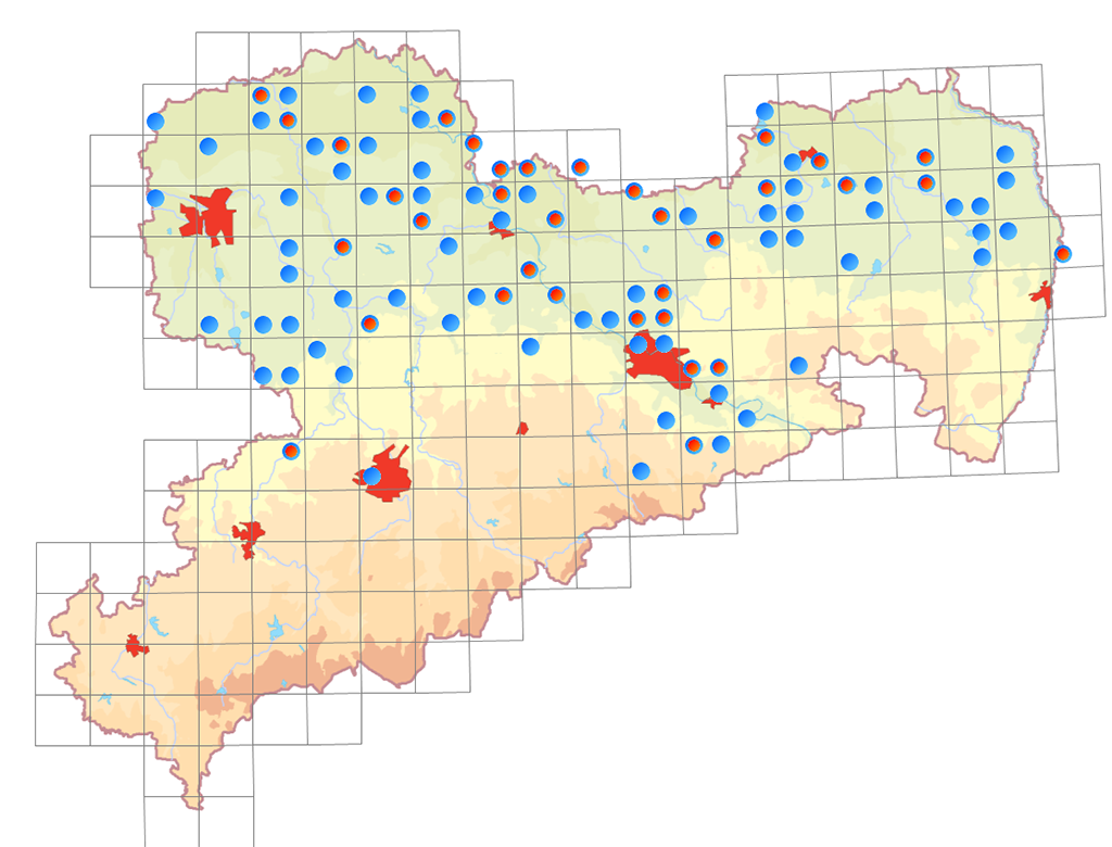 Vorkommen des Grauen Langohrs (Plecotus austriacus) in Sachsen ab 2005 (Blaue Punkte). Rote Punkte: Wochenstuben ab 2005 | Karte: Zentrale Artdatenbank (ZenA) beim LfULG, Stand Mai 2018.
