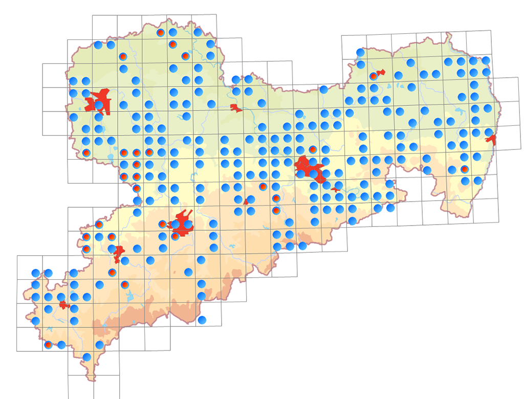 Vorkommen der Fransenfledermaus (Myotis nattereri) in Sachsen ab 2005 (Blaue Punkte). Rote Punkte: Wochenstuben ab 2005 | Karte: Zentrale Artdatenbank (ZenA) beim LfULG, Stand Mai 2018.
