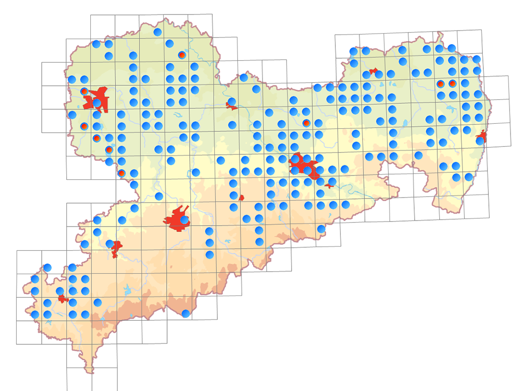 Vorkommen der Rauhautfledermaus (Pipistrellus nathusii) in Sachsen ab 2005 (Blaue Punkte). Rote Punkte: Wochenstuben ab 2005 | Karte: Zentrale Artdatenbank (ZenA) beim LfULG, Stand Mai 2018.