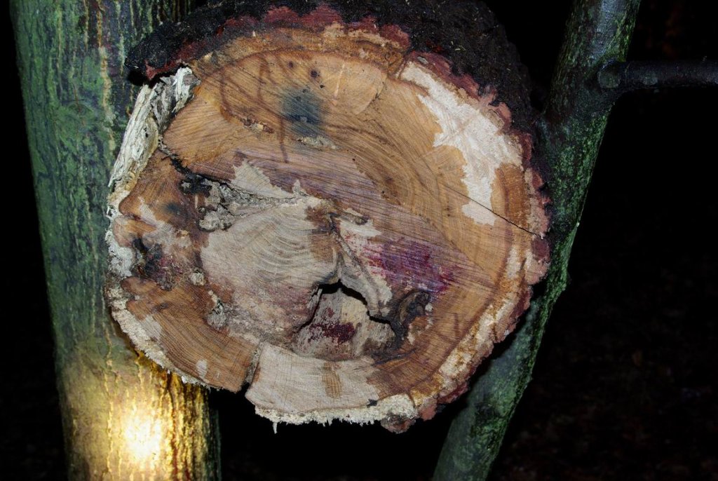 Bei der Fällung dieses Baums wurde eine Höhle zersägt worin sich gerade Abendsegler aufhielten. Blutspuren lassen auf verletzte Tiere schließen. | Foto: Thomas Frank