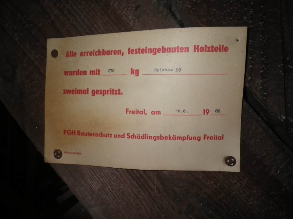 Hinweisschild auf Hylotox-Behandlung in einem Dachstuhl. | Foto: Bianka Schubert