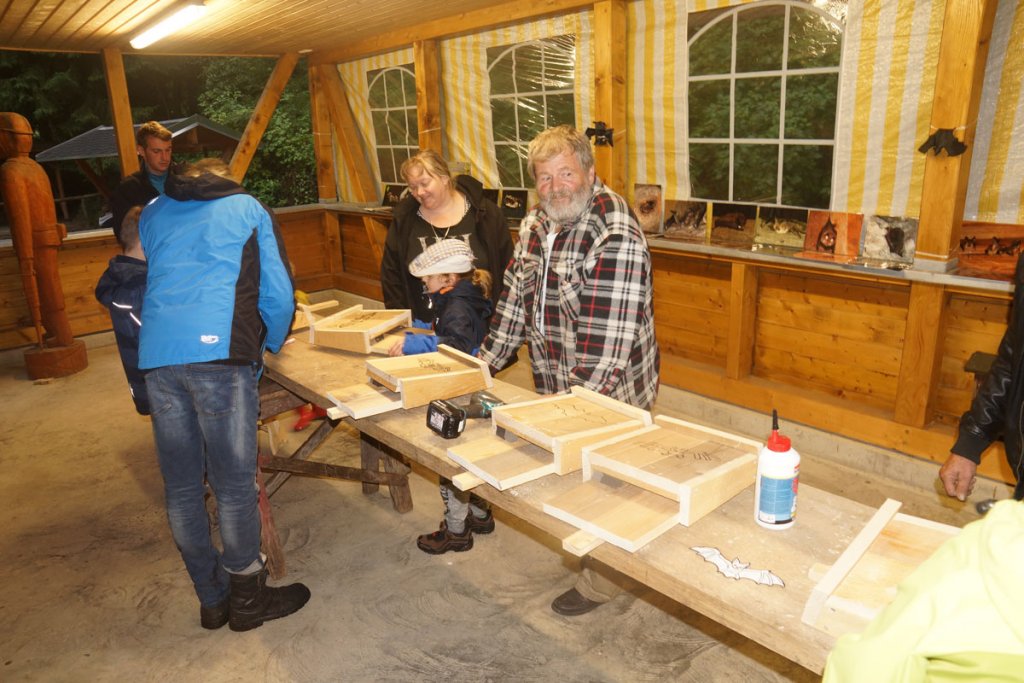 Vom Wanderrastplatz Naturschutzstation „Zum Hohen Forst“ war am Abend des 23. Juni 2018 lautes Hämmern zu hören. Kinder zimmerten gemeinsam mit ihren Eltern, unter Anleitung von Mitgliedern der NABU-Gruppe – Fraucke Bregulla und Sohn sowie Wolfgang und Jürgen Rottluff – neue Quartiere für Fledermäuse. Insgesamt 10 Kästen entstanden, jeder ein Unikat. Mittels vorgefertigter Schablone konnten die Gäste einen Fledermausumriss auf den Kasten übertragen und „ihre“ Fledermaus kreativ gestalten. „Mit beeindruckenden Ergebnissen“, so Fledermausspezialist Heiko Goldberg vom NABU Kirchberg. Noch am Abend brachten Gäste und NABU eines der neuen Quartiere auf dem Gelände der Naturschutzstation an. Dabei konnten gleich weitere Fragen der wissensdurstigen Besucher beantwortet werden, so z. B. dass Fledermauskästen vorzugsweise Richtung Süden in einer Höhe von 3 bis 5 Metern aufgehängt werden sollen und freier Anflug gewährt sein muss.