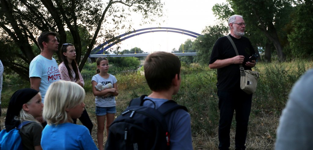 „Ich bin überwältigt“ – Mit diesen Worten begrüßte Ranger Udo Reiss die anwesenden Gäste im Naturparkhaus der Dübener Heide am Abend des 03.08.2018. Die Ankündigung „Fledermausexkursion an der Mulde - Auf den Spuren der Schönen der Nacht“ lockte insgesamt 54 Erwachsene und Kinder in den Veranstaltungsraum der Naturparkverwaltung, der selten so überfüllt ist wie an diesem Abend. Alle Gäste lauschten aufmerksam dem Vortrag der NABU Fledermaus-Expertin Bianka Schubert und konnten dabei allerlei Fragen stellen. Der Aufruf beim aktuellen NABU-Projekt „Quartierpaten für Fledermäuse gesucht“ teilzunehmen, stieß hier auf viele offene Ohren. Anschauungsmaterial sowie Broschüren lagen aus um sich in der Pause noch ein wenig mit den Tieren zu beschäftigen. Durch den zweiten Teil der Veranstaltung führte der regionale Fledermaus-Betreuer Rolf Schulze. Mit Ultraschall-Detektor gewappnet, geleitete er die Gäste zur Mulde und berichtete aus seinem reichen Erfahrungsschatz. So wie die Dämmerung einbrach, warteten alle Teilnehmer gespannt auf die Flattermänner – doch der Himmel blieb leer und der Detektor stumm.
