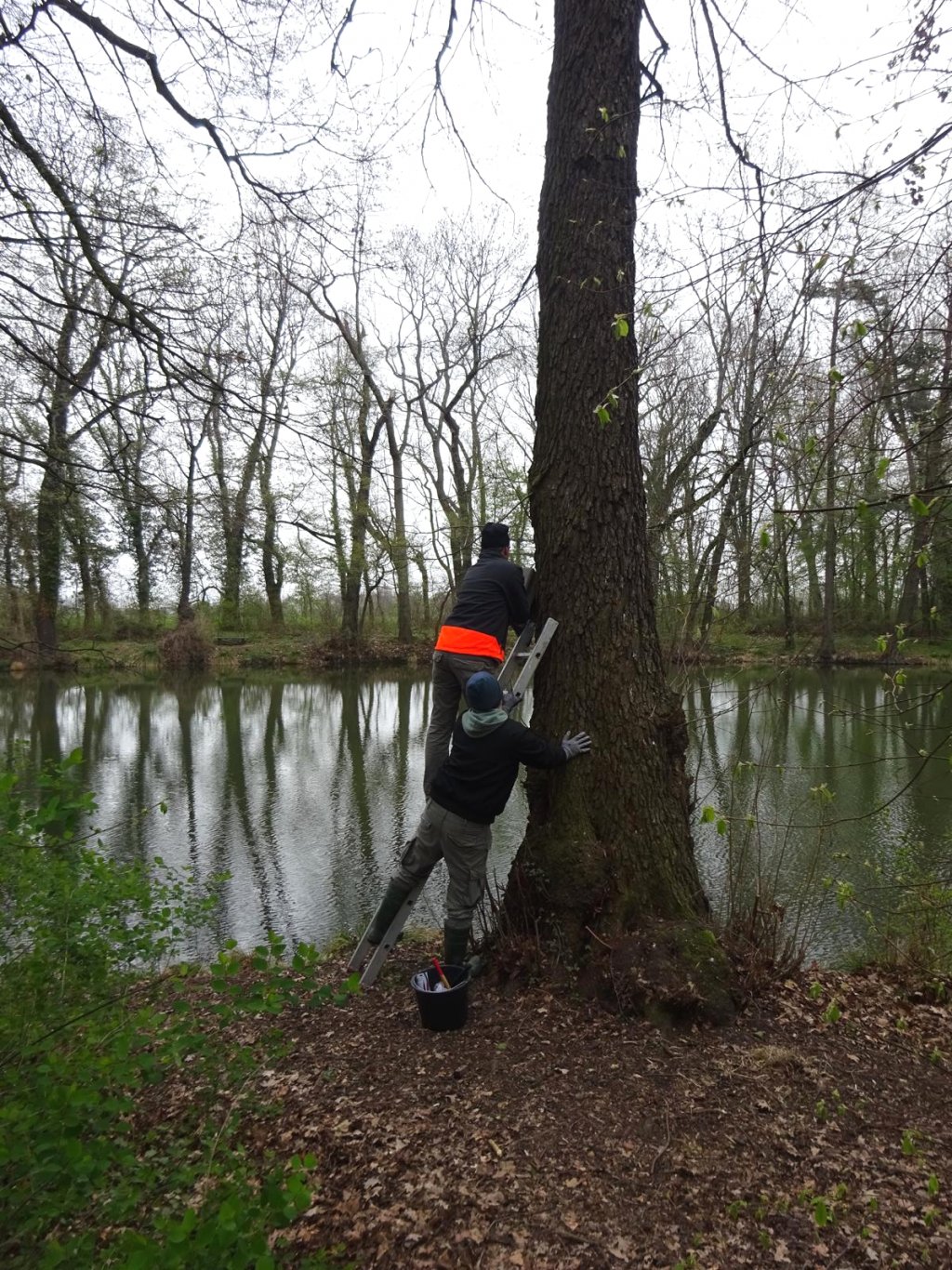 An den ausgewählten Bäumen werden spezielle Halterungen mit Alu-Nägeln angebracht, wo die Kästen nur eingehangen werden müssen. Bei der Arbeit auf einer Leiter ist eine zweite Person oft hilfreich. | Foto: Bianka Schubert