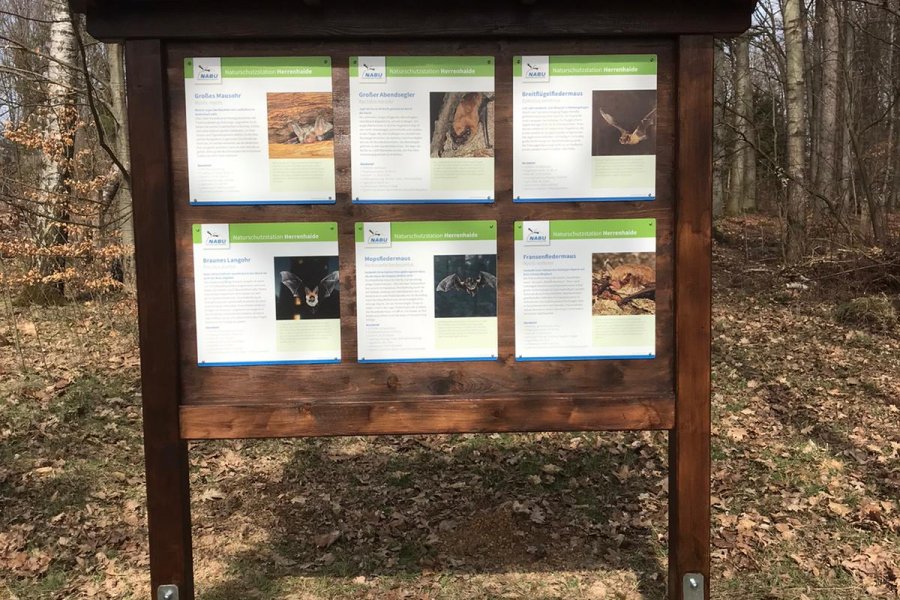 In der Naturschutzstation Herrenhaide gibt es außerdem seit einem Jahr eine Schautafel “Fledermäuse und ihre Lebensweise”. Im Rahmen der Förderung durch den Bundesverband wurden hierzu weitere Schilder hergestellt, die die Porträts von den bislang 10 nachgewiesenen Fledermausarten in der Region zeigen. Auf zwei großen Holzinfotafeln sind diese Schilder neben der Schautafel platziert und können Besuchern der Naturschutzstation auch außerhalb von Veranstaltungen über Fledermäuse Informationen bieten.