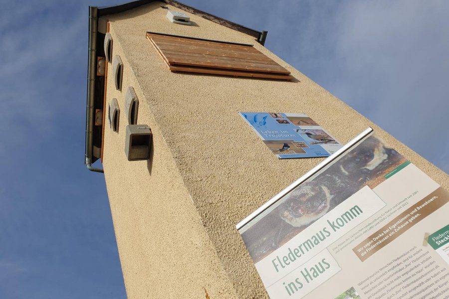 Für die Südostseite des Turms fertigte der ortsansässige Tischler nach Vorgaben des NABU ein besonderes Fledermausquartier. Die Holzverkleidung ist 1,50 Meter hoch und 2 Meter breit und hat zwei Spaltenquartiere. Alle Innenflächen und die Anflugfläche haben Rillen, sodass sich die Fledermäuse gut festhalten können. Schräge Leisten als Abstandshalter lassen die Hinterlassenschaften der tierischen Nutzer nach unten herausfallen. Direkt unter dem Quartier informiert eine Infotafel über mögliche Untermieter am Trafohaus, über die Initiatoren und in Memoriam an Ingeborg Mauke. Dank der Spenderin konnten die Quartiere erworben werden.