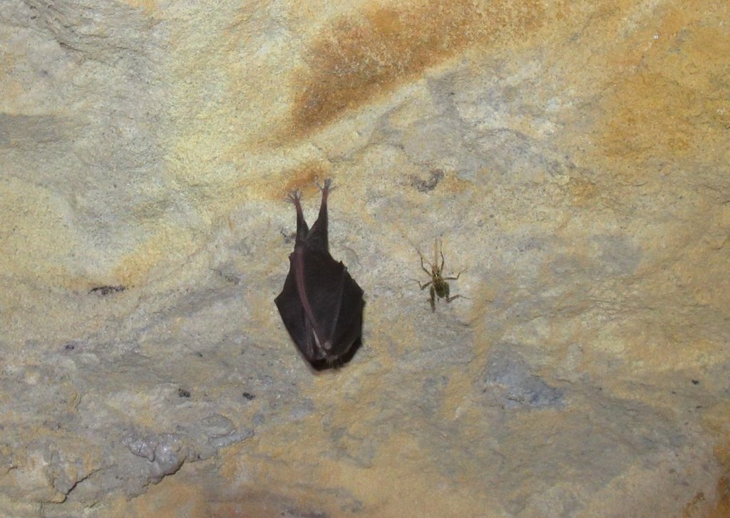 Der seltene Anblick einer Kleinen Hufeisennase und einer Bedornten Höhlenschrecke in einem Winterquartier in der Sächsischen Schweiz. | Foto: Bianka Porschien