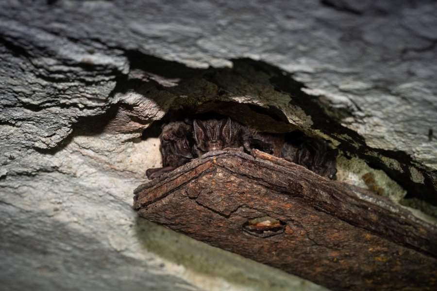 Gruppe Mopsfledermäuse im Winterquartier. | Foto: Marco Roßner