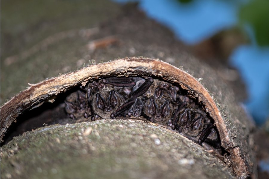 Mopsfledermauskolonie aus Weibchen mit ihren Jungtieren hinter Borkenschuppe. | Foto: Marco Roßner