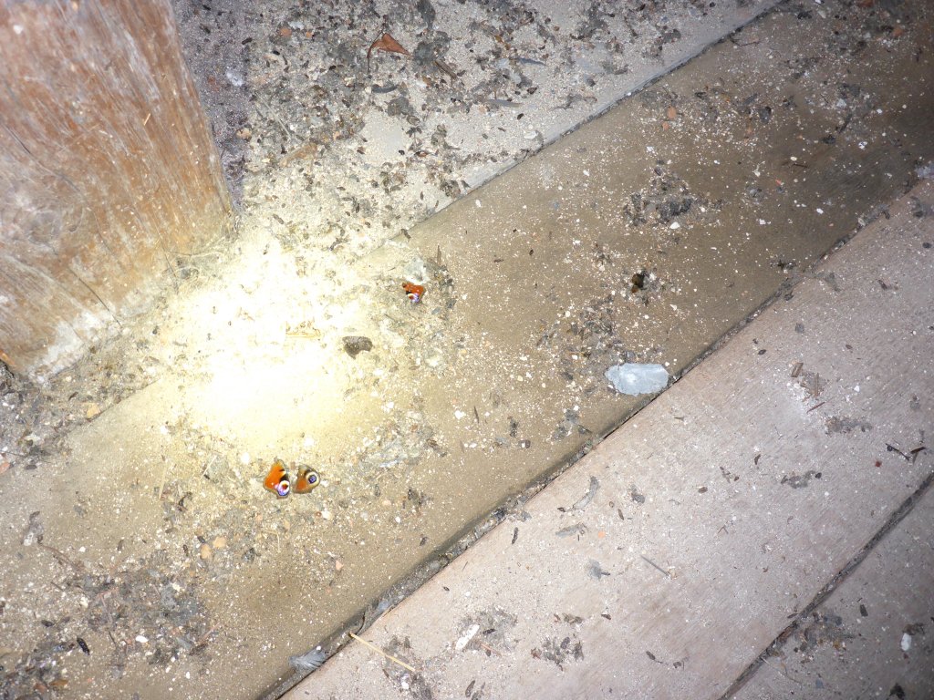 Die Reste von Falterflügeln am Fußboden weisen auf einen Frassplatz einer Fledermaus hin | Foto: Johannes Böhme