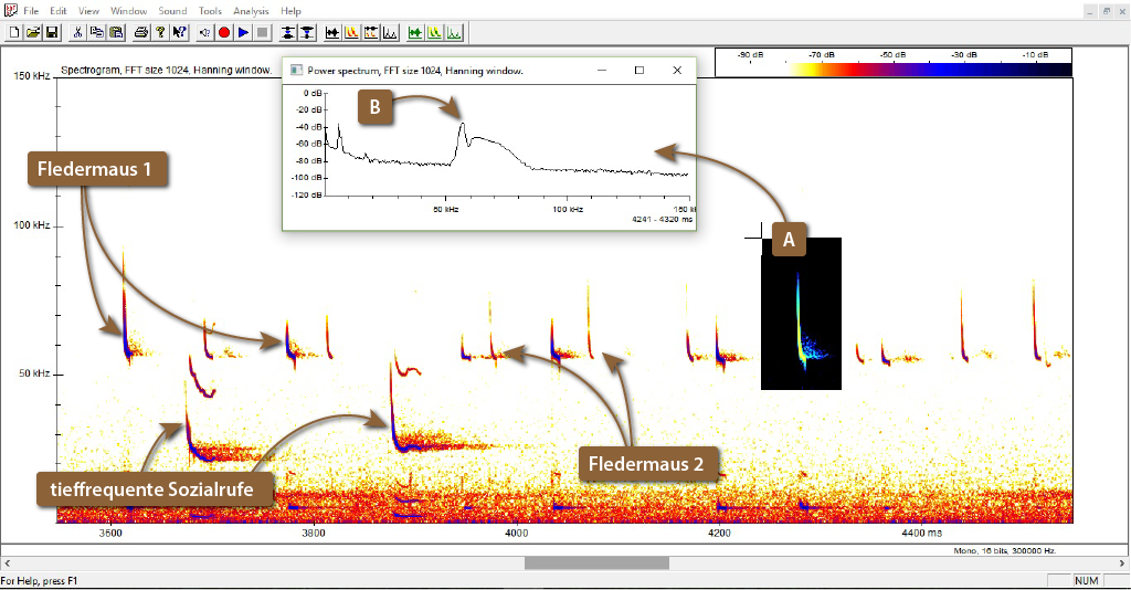 Beispiel-Aufnahme von 2 Mückenfledermäusen mit Sozialrufen in einem Sonagramm Fledermaus 2 scheint weiter weg zu sein als Fledermaus 1, weil der Ruf leiser bzw. heller in der Darstellung ist. A: markierter Fledermausruf, zur Vermessung B: der Peak in der Kurve zeigt die Hauptfrequenz im Ruf an - der Bereich, wo der Fledermausruf am lautesten ist. Hier 57kHz. Das Maß ist ein wichtiges Unterscheidungsmerkmal zur Artbestimmung bei den Fledermausrufen. | Grafik: Uwe Schroeder