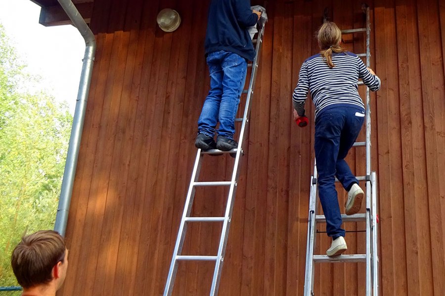 Um einige Tiere beringen zu können, musste ein Fledermauskasten von der Fassade abgebaut werden. Der Schulleiter (rechts auf der Leiter) packte fleißig mit an. | Foto: Bianka Schubert
