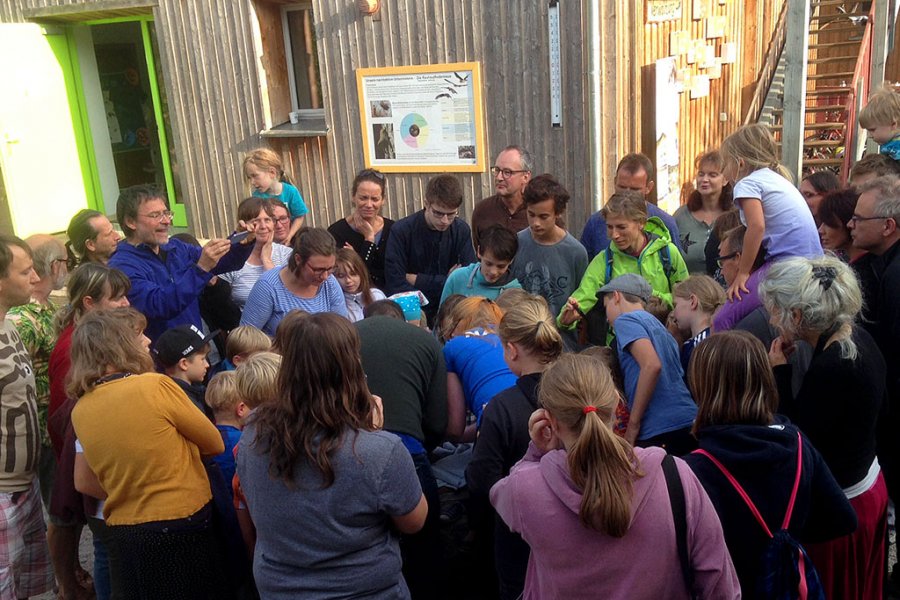 Die diesjährige Ausflugzählung beging die Montessori-Schule feierlich mit einem Fledermausfest am 25.08.2018. Zu diesem Anlass wurde eine schon lange geplante Informationstafel zur Rauhautfledermaus enthüllt. Rund 40 Erwachsene und Kinder fanden sich an diesem Tag ein, bei dem man sich über Fledermausbehausungen informieren, Fledermäuse basteln und Fledermaus-Bowle trinken konnte. Mit einem warmen Buffet und einem Fledermausvortrag wurde schließlich die Zeit bis zur Dämmerung überbrückt, um dann die ausfliegenden Tiere zu zählen. Und siehe da: Neben 28 Rauhautfledermäusen konnten außerdem 3 Breitflügelfledermäuse – eine weitere neue Untermieter-Art – beobachtet werden. Wir dürfen auch hier auf die weiteren Besiedlungserfolge in den Fledermauskästen gespannt sein.