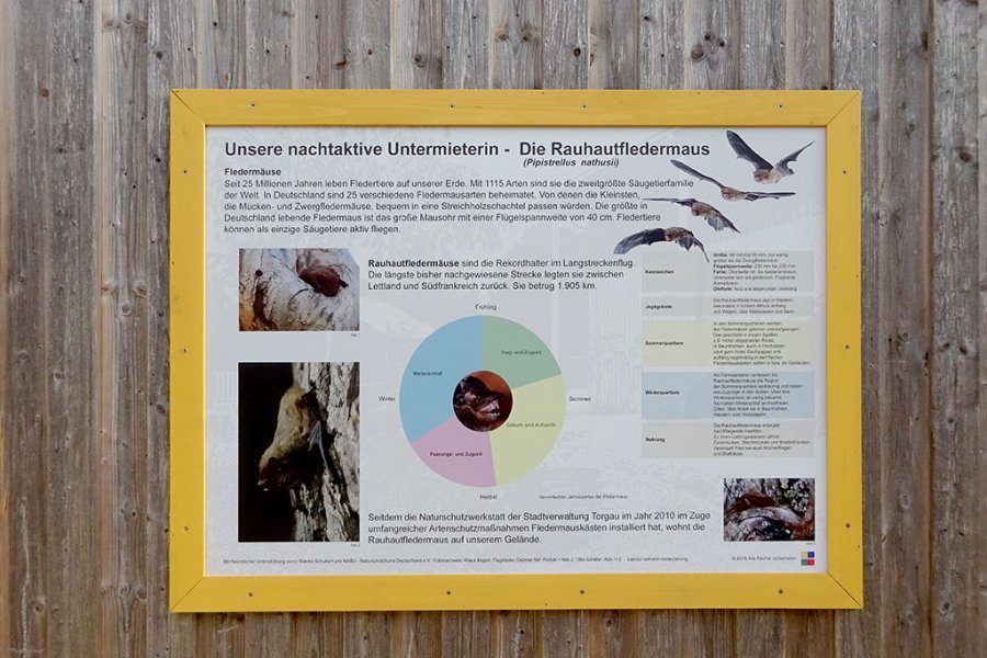Im Jahr 2010 setzte die Naturschutzwerkstatt Torgau zahlreiche Artenschutzmaßnahmen an den Gebäuden der freien Grund- und Mittelschule Pro Montessori e. V. um. Ziemlich schnell zogen dort die ersten tierischen Untermieter ein. Vor drei Jahren wurde an einem der Gebäude eine Besonderheit für die Region entdeckt: eine Wochenstube der Rauhautfledermaus. Dass in der Region Torgau während der Herbstwanderungs- und Paarungszeit Rauhautfledermäuse vorkommen, ist den Fledermausexperten bereits seit vielen Jahren bekannt. Neu war aber der Reproduktionsbeleg, einer der wenigen für diese Art in Sachsen. 2016 konnten an den Quartieren der Montessori-Schule 14 Jungtiere beringt und insgesamt 29 Tiere in den Kästen gezählt werden.