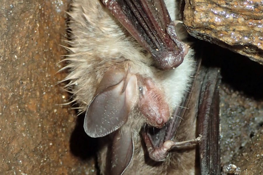 Die in unterirdischen Quartieren überwinternden Fledermausarten wie Wasser-, Fransenfledermaus und Großes Mausohr sind stark innerlich gesteuert, wann sie endgültig aus dem Winterschlaf erwachen und die Winterquartiere verlassen. Die einzelnen Arten wandern schwerpunktmäßig zu unterschiedlichen Zeitpunkten ab. Zu den "Spätaufstehern" gehört auch die seltene Bechsteinfledermaus. Das Tier auf dem Foto ist am Unterarm etwas mit Lehm verschmiert, was darauf hindeutet, dass es in einer tiefen Spalte überwinterte.