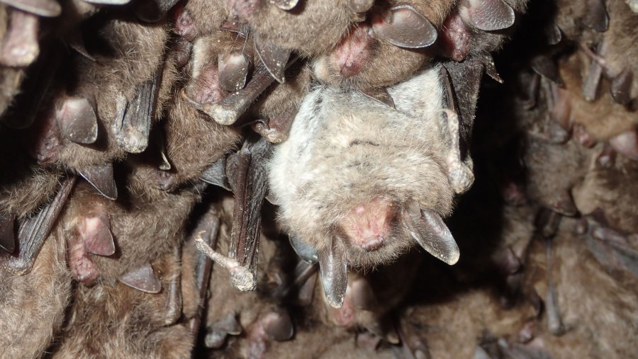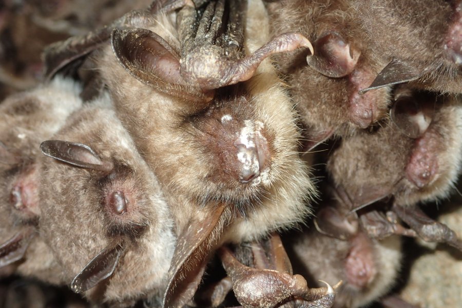 Weiße Flecken in der Gesichtspartie des Mausohrs weisen auf einen Schimmelbefall hin. Bekannt ist dieses Erscheinungsbild unter dem Begriff White-Nose-Syndrom. | Foto: Ulrich Zöphel