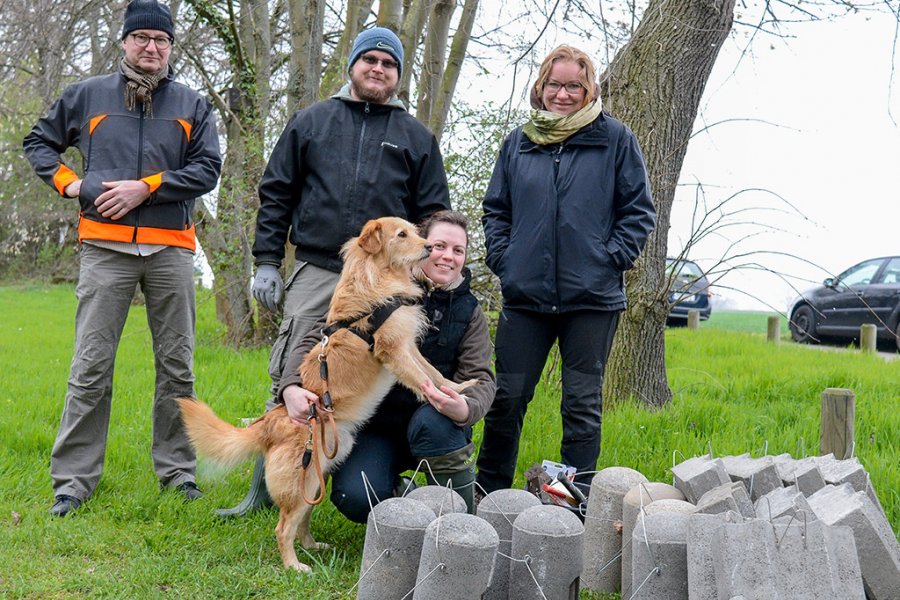 V.l.n.r.: Stefan Plaszkorski, Norman und Mandy Graf mit Rüde Swift sowie Bianka Schubert bringen 25 Fledermauskästen in Weßnig an. | Foto: Kristin Engel