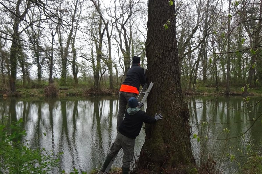 An den ausgewählten Bäumen werden spezielle Halterungen mit Alu-Nägeln angebracht, wo die Kästen nur eingehangen werden müssen. Bei der Arbeit auf einer Leiter ist eine zweite Person oft hilfreich. | Foto: Bianka Schubert