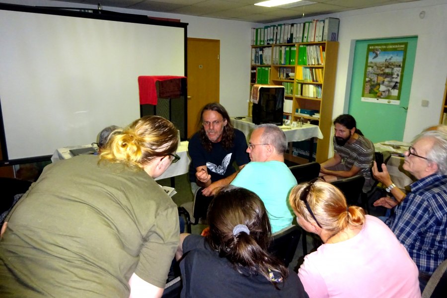 Seit 1993 gibt es die Naturförderungsgesellschaft Ökologische Station Borna-Birkenhain e. V. im Südraum Leipzig, welche sich mit lokalen und überregionalen Artenschutzbelangen beschäftigt. Seit vielen Jahren kümmern sich die Mitarbeiter in der Pflegestation zusätzlich um verletzte oder geschwächte Wildtiere, darunter auch viele Fledermäuse. Im Laufe der Zeit entstand so ein breiter Wissensfundus, der gemeinsam mit dem Quartierpaten-Projekt in einer Fledermausschulung an Interessierte vermittelt werden sollte. Am 26. Juli 2019 luden der NABU Sachsen und die Ökologische Station daher gemeinsam zum „Fledermaus-1x1 in Theorie und Praxis“ ein. Franziska Rudolph und Katharina Wollschläger von der Ökologischen Station führten durch das Programm und boten einen umfangreichen Einstieg in die Fledermausmaterie. Der ehrenamtliche Fledermausbetreuer Andreas Woiton brachte eigene Erfahrungen ein und konnte alle 14 Besucher insbesondere mit dem Zeigen einiger Fledermauspflegetiere, die sich derzeit zur Behandlung in der Pflegestation befinden, begeistern.